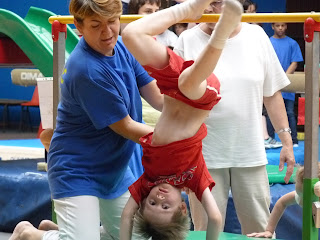 The boys had their end-of-year gymnastics "competition" this past weekend. I had tried to explain to Benjamin that it wasn't a true competition, but he still gave a disgusted sigh when we arrived, saying, "I didn't know it was just to play!" But as he watched the other kids, he got over his pique, and decided it would be ok to participate. (Seeing the medals helped motivate him.)