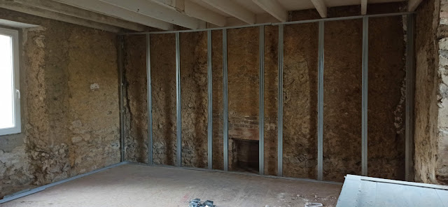 How is the house coming, you ask? Well, here is the progress - slow, slow progress. Frédéric and Noah spent a week in August putting rails and insulation in the living room.
